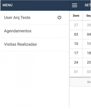 Após logar na aplicação, no canto superior esquerdo poderá ser visualizado o botão para ser exibido os menus 'Agendamentos' e 'Visitas Realizadas' disponíveis.