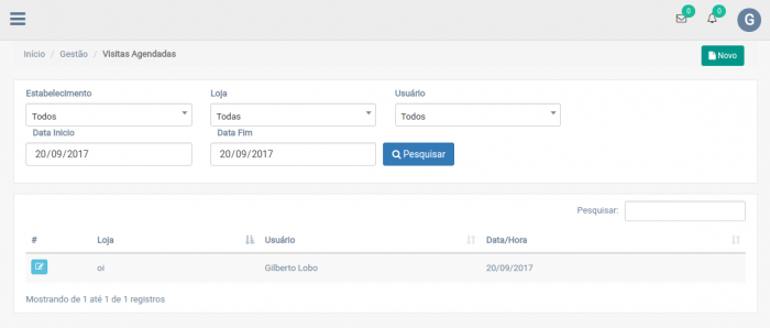 Na tela exibida na imagem acima clique em 'Novo'. Posteriormente basta selecionar o estabelecimento e loja que o questionário será aplicado, o usuário que irá aplicar o questionário, a data da aplicação e os questionários que serão aplicados nessa visita.