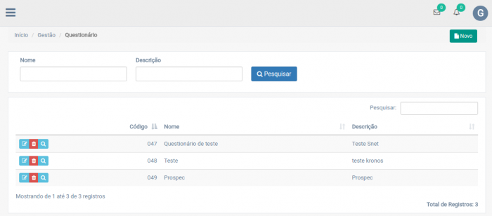 Na tela exibida na imagem acima clique em 'Novo'. Posteriormente basta preencher os campos conforme desejado, nome, descrição e questões.