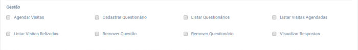 Para que os usuários possam visualizar as telas de agendamento, questionário e visitas realizadas, devem ter as permissões de telas da parte de Gestão: