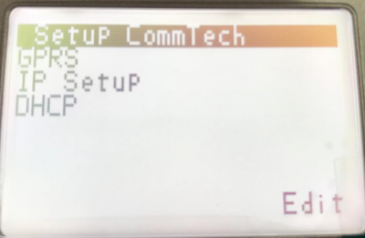 Passo 17: A próxima tela da Comm Tecnology a opção IP_Setup pressione a tecla lilás para acessar o menu Edit selecione DHCP e pressione a tecla verde, conforme imagem abaixo.