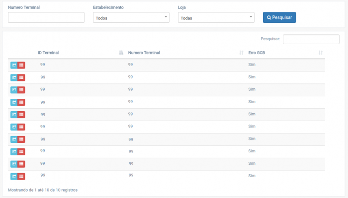 Ao acessar o menu em questão, basta clicar em pesquisar que será exibido todos os terminais que estão bloqueados por terem recebido a mensagem de ERRO INTERNO do Banco do Brasil.