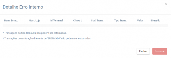 O botão da direita (Vermelho) exibirá as informações da transação que ocorreu o erro interno. Basta clicar que será aberto uma janela indicando: Número do estabelecimento, número da loja, Id terminal, chave J, código da transação, tipo da transação (Consulta/Pagamento), Valor, Situação (status).