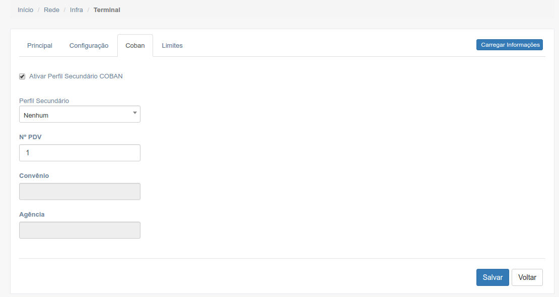 Por fim, na aba coban das configurações do terminal (Rede/Infra/Terminal), marque a opção 'Ativar Perfil Secundário COBAN' e selecione o perfil criado por você.
