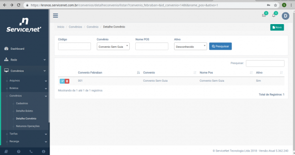 Seguindo o menu Início > Convênios > Convênios > Detalhe Convênio , verifique se o detalhe convênio está presente e ativo: